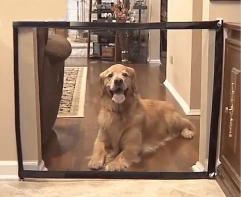 - The Magic Pet Gate is built with tough, partially see-through fiberglass fabric woven to withstand abuse from pets, which is designed to endure pets' claws. so it is very hard to be broken and the dogs can NOT get through easily.
