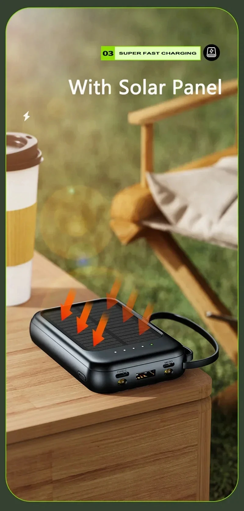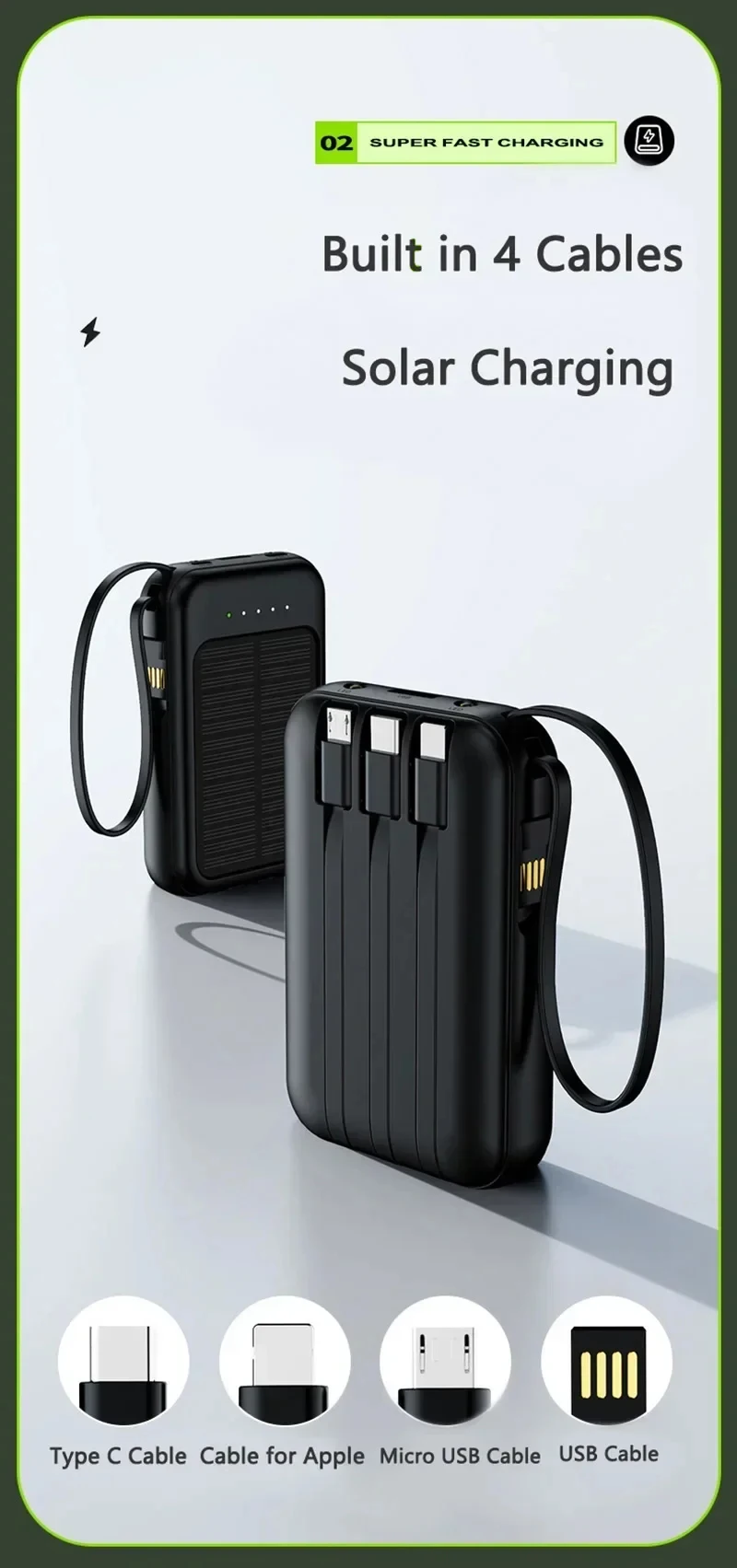 Solar Power Bank with Built Cables